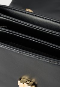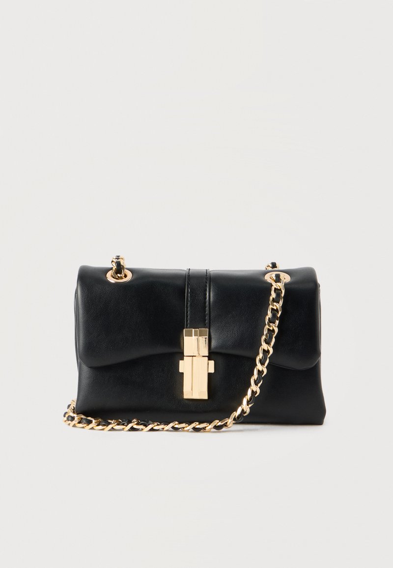 Melna ādas plecu soma ar zelta tonī ķēdes siksnu un taisnstūrveida zelta sprādzi, uz gaišas vienkrāsainas fona.
