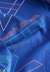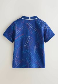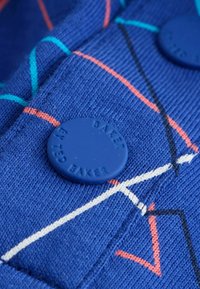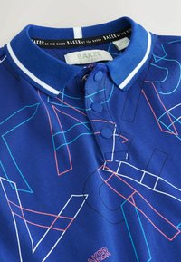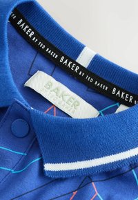 Zils polo krekls ar apkakli. Raksturots ar ģeometrisku sarkanu un tirkīza krāsu rakstu, īsām piedurknēm un pogām pie apkakles. Kokvilnas audums.