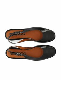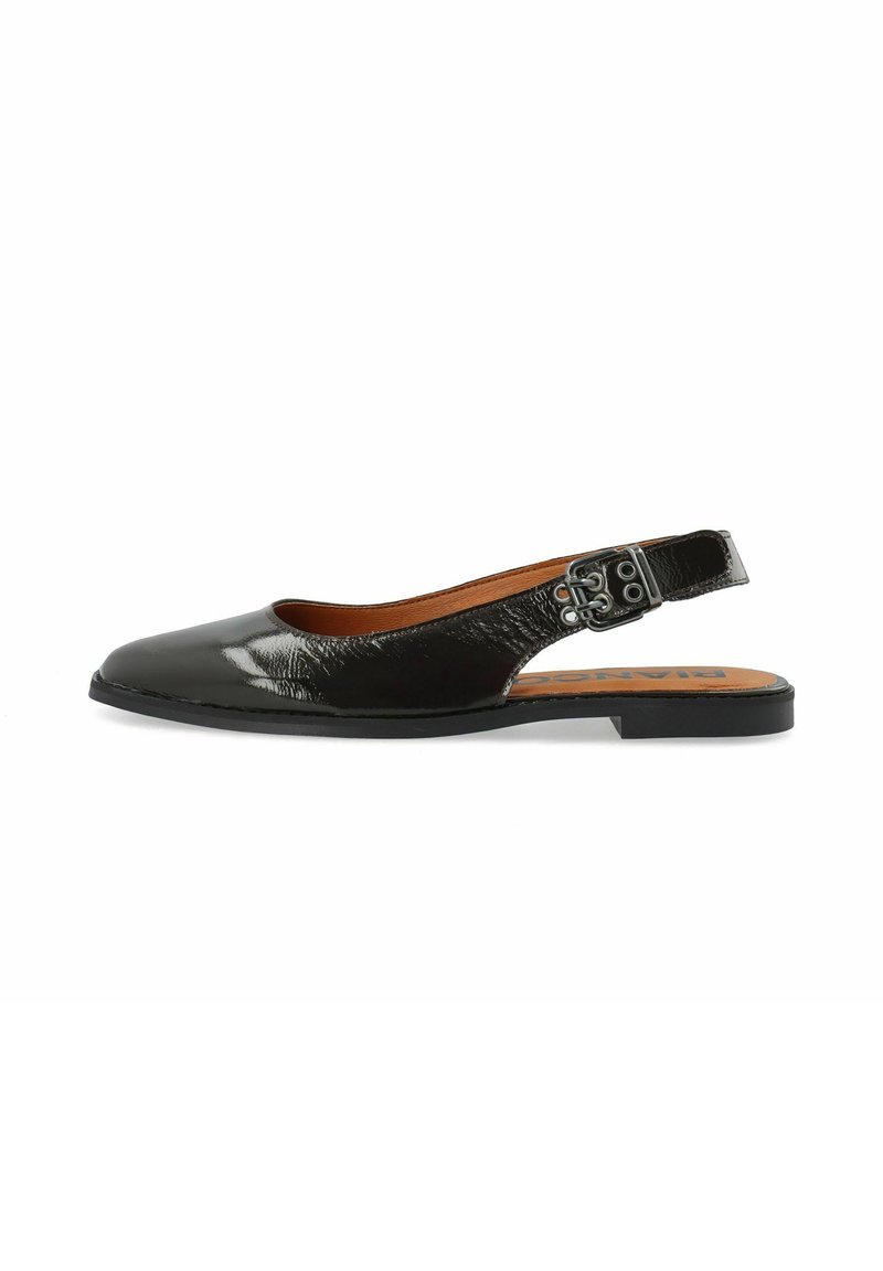 Melna lakādas spieķa stila kurpe ar plakanu zoli, smailu purngalu un regulējamu sānu sprādzi uz brūnas zolītes.