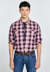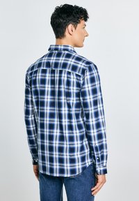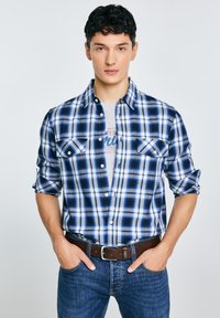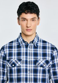 Zils un balts pledēts flaneļa krekls ar krūšu kabatām, pogājamu apkakli un uzpītiem piedurknēm, uzvilkts pāri pelēkai grafiskajai T-kreklam.