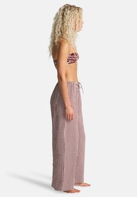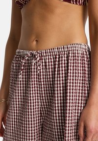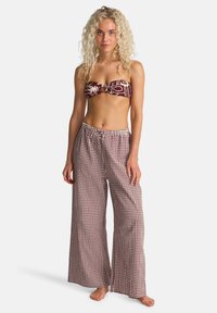 Tumši sarkans bikini augšdaļa ar baltu abstraktu rakstu; plašas bikses no rūtainas bordo un baltas auduma; vaļīgs piegriezums ar elastīgu jostasvietu.