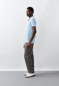 Jauns vīrietis, kurš valkā gaiši zilu īsroku polo kreklu un pelēkas bikses, stāvot pret vienkāršu balto fonu.
