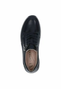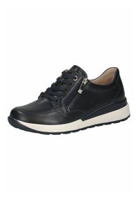 Tumši zils ādas tenisa apavs ar gludu tekstūru, dekorēts ar rāvējslēdzēja akcentu, auklu aizdari un divu toņu zoli kontrasta radīšanai.