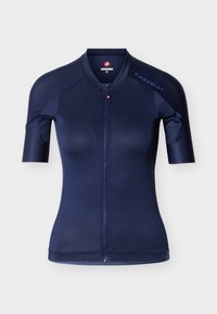 Sieviete stāv, valkājot gaiši violetu apģērbu ar īsām piedurknēm un melnas polsterētas riteņbraukšanas šortus vienkārša fona priekšā.