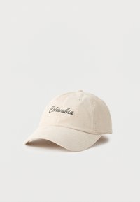 Kaki krāsas Columbia beisbola cepure ar izliekamu aizsegu, priekšpusē izšūta melna kalnu logo un uz sāniem ir uzraksts ar zīmola nosaukumu.