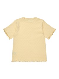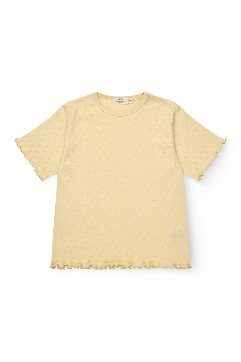 Gaiši dzeltens īsroku trikotāžas topiņš ar viļņotām malām uz piedurknēm un apakšmalu, ar smalku teksturētu rakstu visā virsmā.