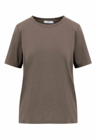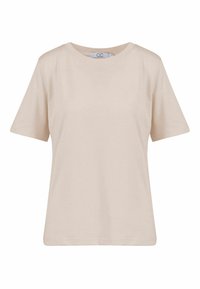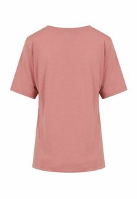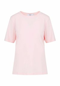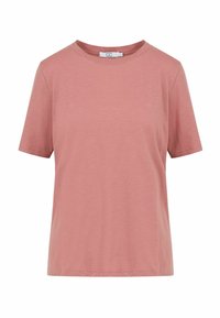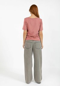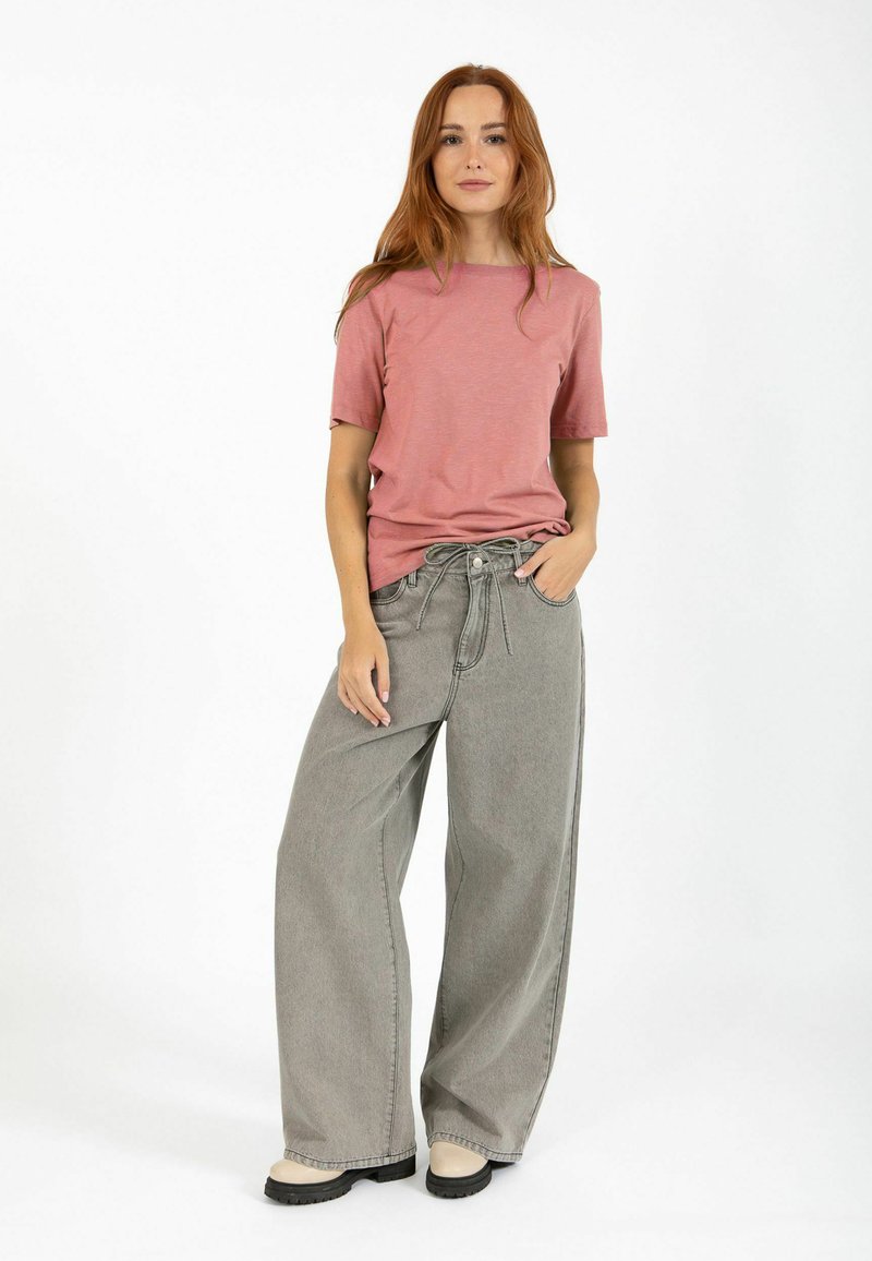 Sieviete ar gariem sarkaniem matiem stāv, valkājot putekļaini rozā īsām piedurknēm krekliņu, augsta vidukļa brīvi krītošas pelēkas džinsas un bēšas zābaciņus uz baltas fona.
