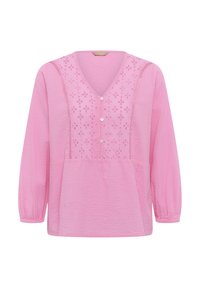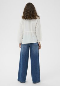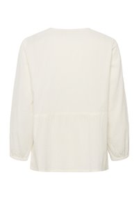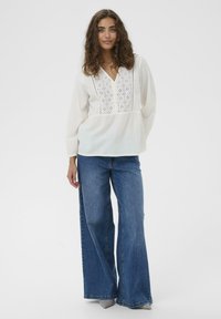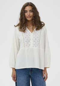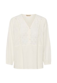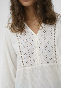 Balta, teksturēta blūze ar garām piedurknēm, V veida kakla izgriezumu un pogu aizdari, ar izšūtiem ziedu rakstiem uz krūtīm un plecu daļā.