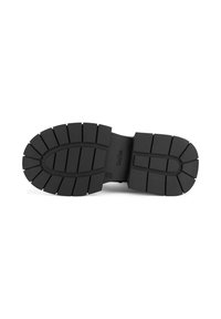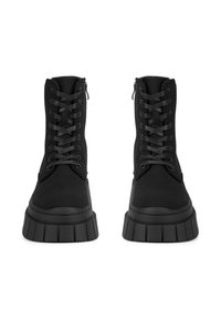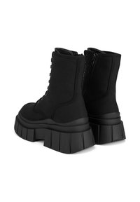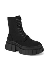 Melnas mežģīņu potīšu zābaki no audekla ar biezām gumijas zolēm, kam ir vertikālas rievas un augsta platforma.
