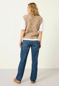 Zili džinsa džinsi ar taisnu kāju piegriezumu, ar smalku izbalēšanu un klasisku piecu kabatu dizainu. Valkāti kopā ar bēša krāsas adītu topu un brūnām koka kurpēm.