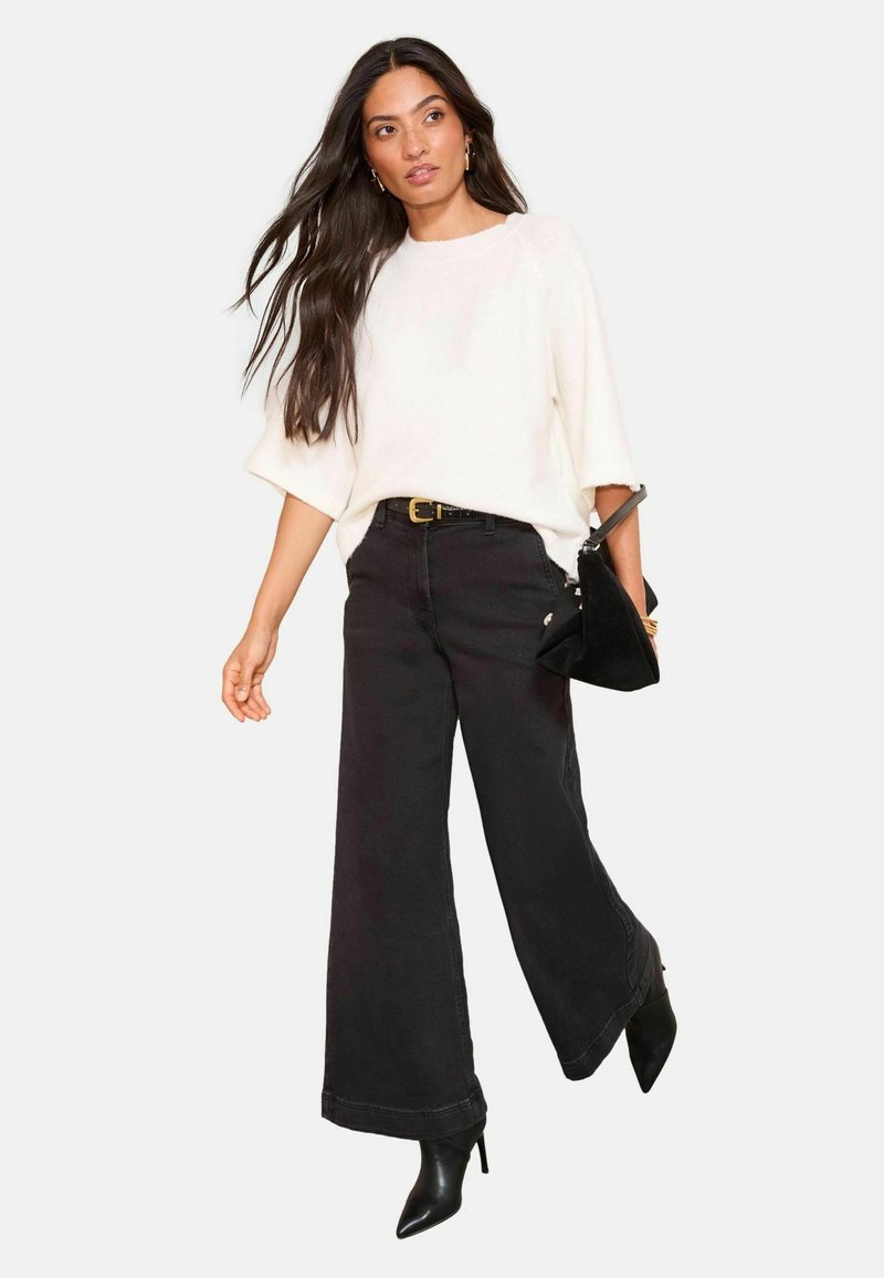 Sieviete staigā, ģērbusies baltā oversized džemperī, platām melnām džinsa biksēm, melnās smailpurnu zābakos un turot melnu rokassomu.