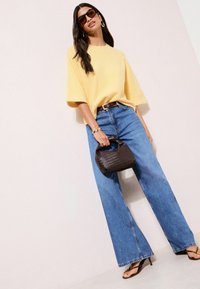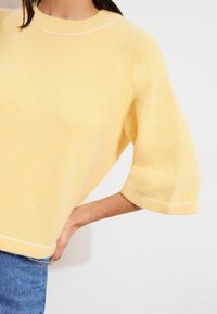 Dzeltena īsroku džemperis ar apaļu apkakli un kontrastējošu apmali, kombinēts ar gaiši ziliem, plašām kājslēdzēm džinsiem. Teksturēts adīts materiāls.