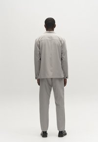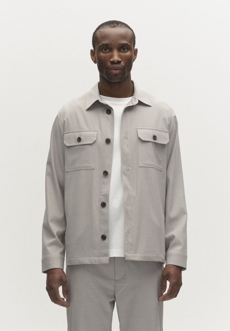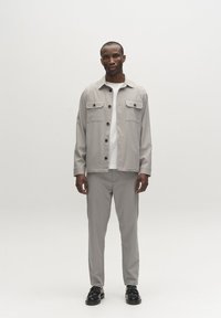 Vīrietis, kurš valkā gaiši pelēku pogātu pārkrekls ar atlokāmiem kabatām virs baltas krekla un atbilstošus gaiši pelēkus bikses, stāv pret vienkāršu fonu.