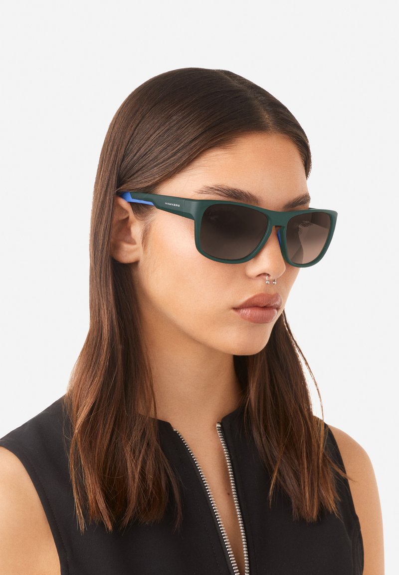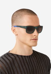 Zaļas matētas saulesbrilles ar ziliem akcentiem, taisnstūra formas un tumši tonētiem stikliem. Modelis ar gariem brūniem matiem un melnu topu ar rāvējslēdzēju.