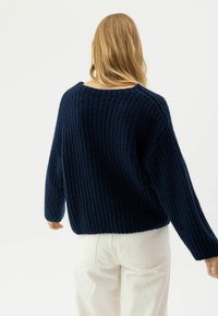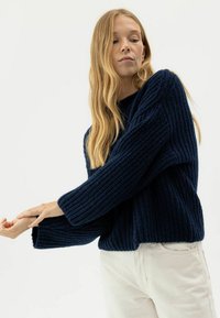 Sieviete ar gariem blondiem matiem, valkājot tumši zilu biezu adītu džemperi un baltas bikses, stāvot pret vienkāršu gaišu fonu.