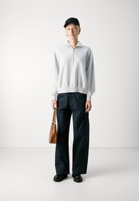Pelēks džemperis, kas izgatavots no mīksta, teksturēta auduma. Tam ir pusievelkamā apkakle, kritušas plecu šuves un pieguļošs jostasvieta. Nēsāts ar tumšām biksēm.