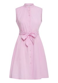 Gaiši zils bezpiedurkņu kleita ar pogu aizdari priekšā, jostu viduklī un sānu kabatām. Izgatavota no mīksta auduma ar gludu tekstūru.