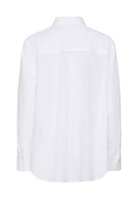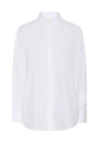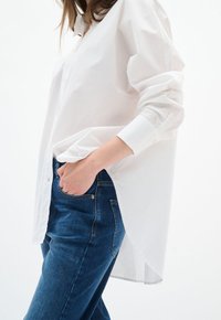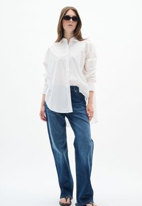 Jauna sieviete valkā pārslaidušu baltu kreklu ar pogām, zilas džinsa bikses un melnas kaķa acs saulesbrilles, stāvot pret baltu fona sienu.