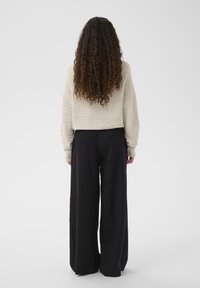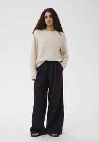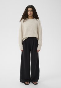 Persona melna platu biksu, bēša ribota garroka džempera un melnu atklātu sandalu valkāšana, stāvot pret viendabīgu fonu.