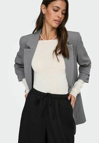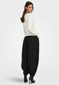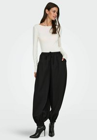 Gara piedurkņu, krēmkrāsas tops ar plašu kakla aizu, kombinēts ar vaļējām melnām biksēm ar elastīgu jostasvietu un sānu kabatām.