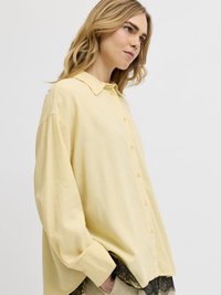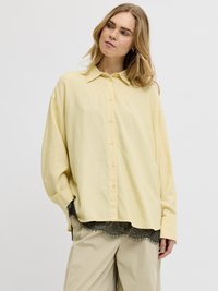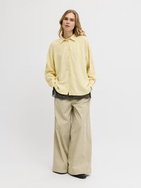 Sieviete ar pleciem piekārtiem blondiem matiem, valkājot pārmēru gaiši dzeltenu pogām aizdares krekla virs melnas mežģīņu krekla un bēšām biksēm, stāvot pret baltu fonu.