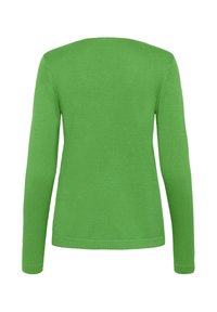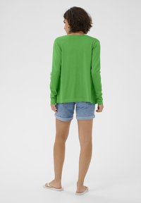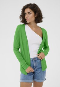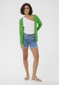 Sieviete ar īsiem cirtainiem matiem, valkājot zaļu kardiganu virs baltas viena pleca topa un uzlocītām džinsa šortām, skatās uz sāniem.