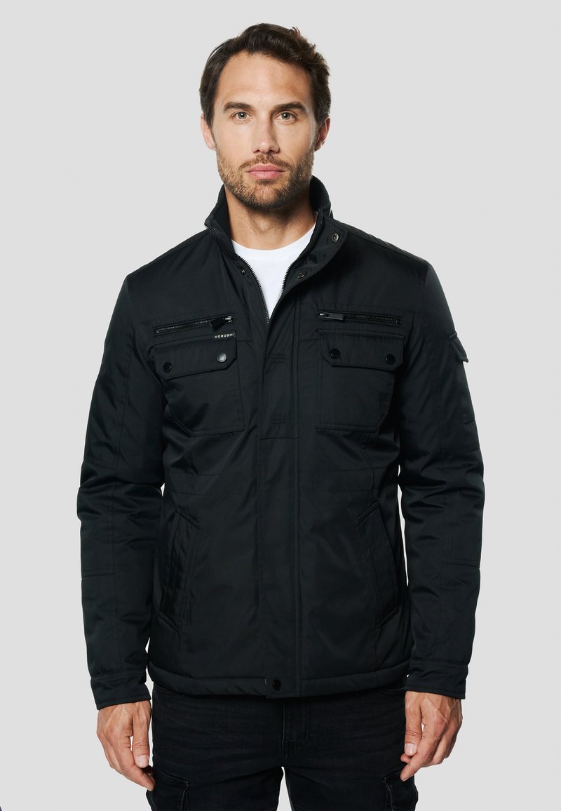 Melna izolēta jaka ar augstu apkakli, vairākiem priekšējajiem kabatām un gludu tekstūru. Aprīkota ar rāvējslēdzēja un spiedpogu aizdares elementiem.