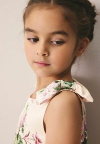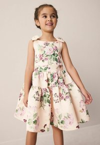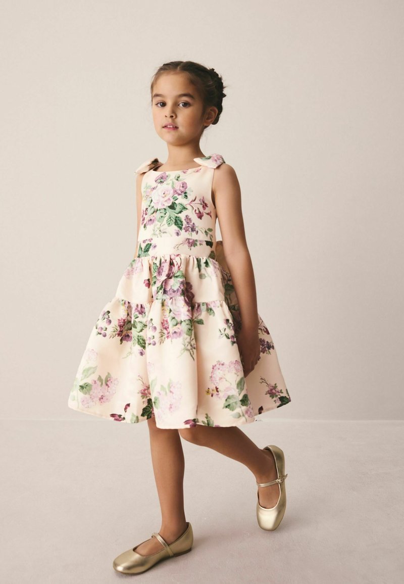 Jauna meitene pastaigājas krēmkrāsas ziedu kleitā ar loku detaļām un zelta krāsas Mary Jane apaviem uz vienkārša fona.