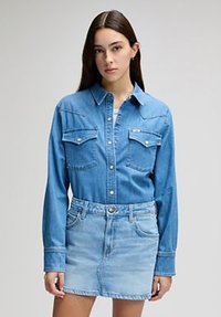 Tumši zila denima krekls ar pogu priekšpusi, norādītu apkakli, krūšu kabatām un garām piedurknēm, ar baltām snap pogām un izliekto apakšu.