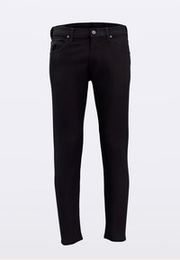 Melnas džinsus ar taisnu piegriezumu, piecu kabatu dizainu un pogu aizdari. Valkāti ar uzrullētām piedurknēm un melniem augstiem sporta apaviem.