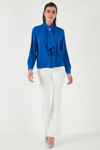 Zila garām piedurknēm blūze ar drapētu priekšpusi, apkakli un pogu detaļām pie aprocēm. Izgatavota no gludas auduma ar nelielu spīdumu.