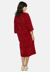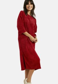 Sarkana, mīksta, vidēja garuma kleita no maigas auduma. Kleitai ir brīva piegrieztne, nolaisti pleci un 3/4 garuma piedurknes. Sānos ir šuvju detaļas.