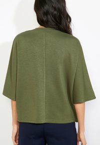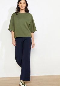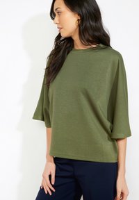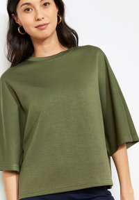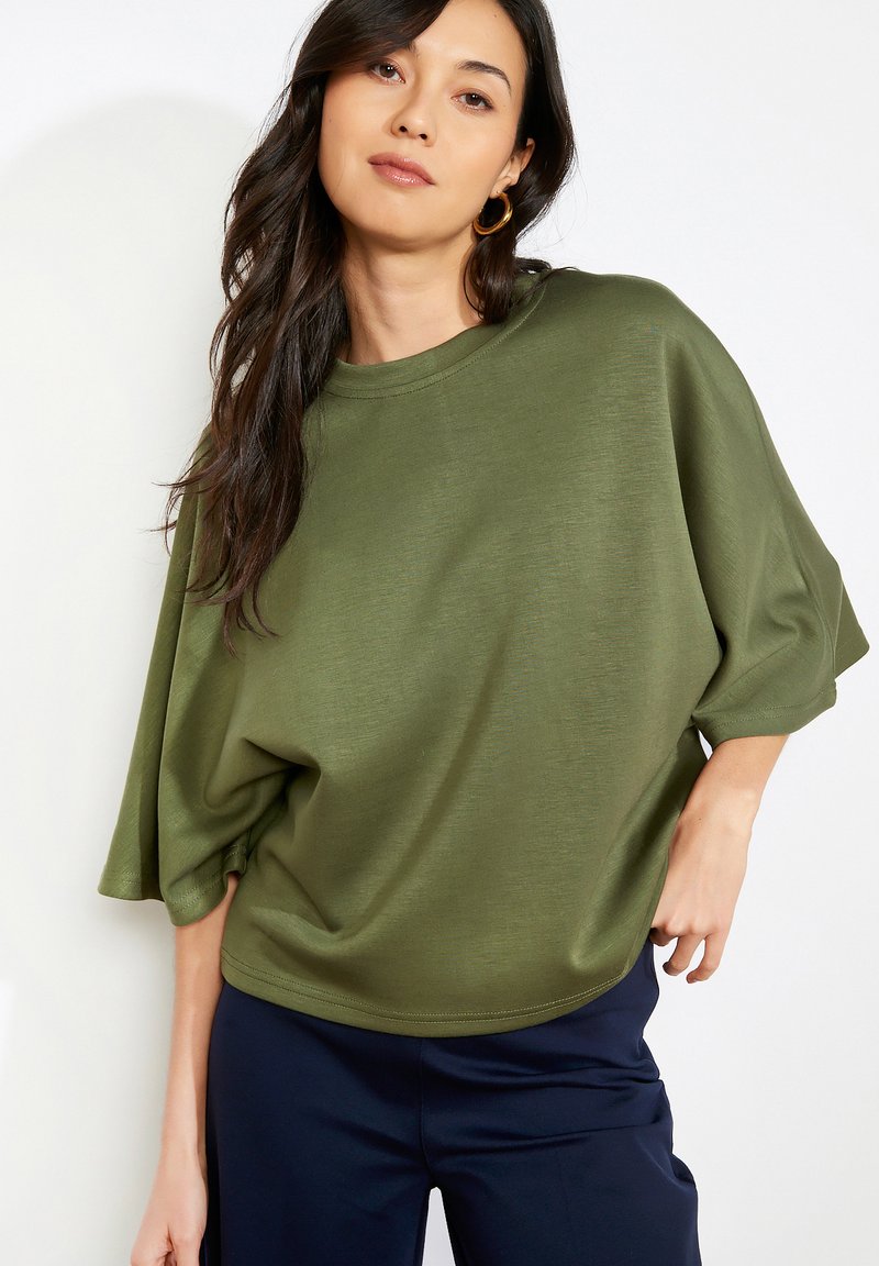 Sieviete ar gariem tumšiem matiem, valkājot zelta riņķa auskarus, olīvu krāsas pārāk lielu īsroku topu un tumši zilas bikses, pozē pret vienkāršu baltu fonu.