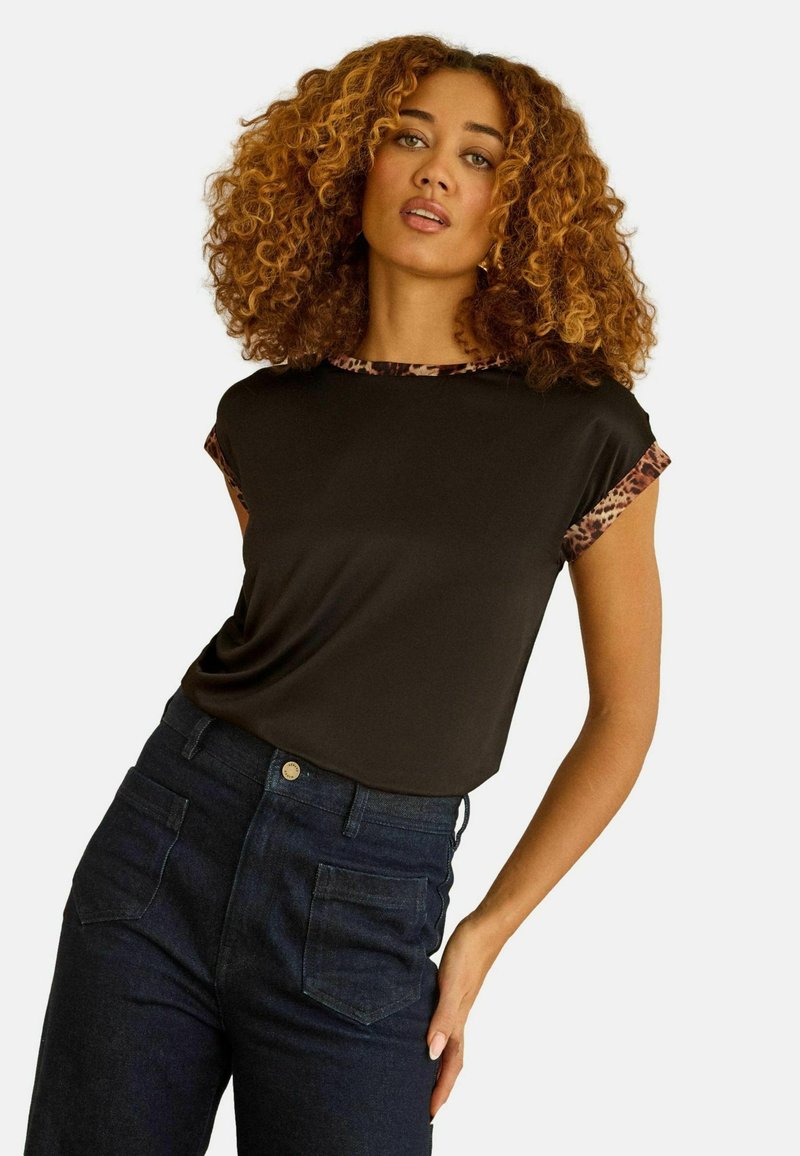 Melna īss piedurkņu T-krekls ar leoparda raksta akcentiem apkaklē un piedurknēs, kopā ar tumšām džinsa biksēm ar lielām aizmugurējām kabatām.