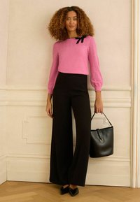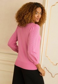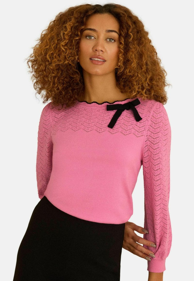 Sieviete ar cirtainiem matiem, kas valkā rozā adītu džemperi ar mežģīņu detaļu un melnu loku uz krūtīm, kopā ar melnu svārku.