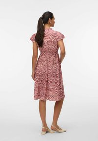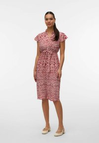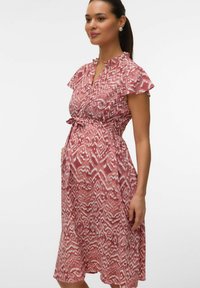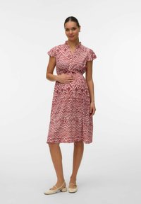 Grūtniece rozā rakstainā grūtnieču kleitā ar plūstošām piedurknēm un jostu viduklī, stāvot pret vienkāršu baltu fonu.