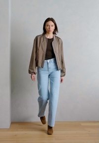 Sieviete, valkājot taupe bomber jaka pār melnu topu un gaiši zilas džinsas, stāvot pret vienkāršu gaiši pelēku fonu.