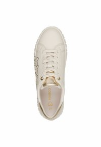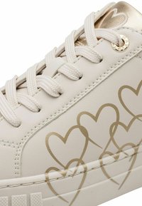 Balts sporta apavu ar teksturētu gumijas zolīti, rotāts ar zelta sirds rakstu un metāliska zlata akcentu papēdī. Auklu aizdare.