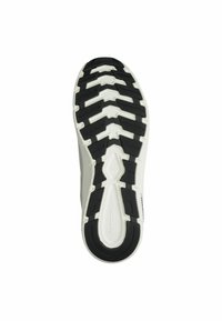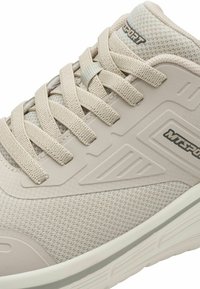 Bēšs sporta apavu pāris ar teksturētu tīkliņa virsu, mežģīņu aizdari, polsterētu apkakli un biezu baltu starpzoli ar melna zole akcentu.