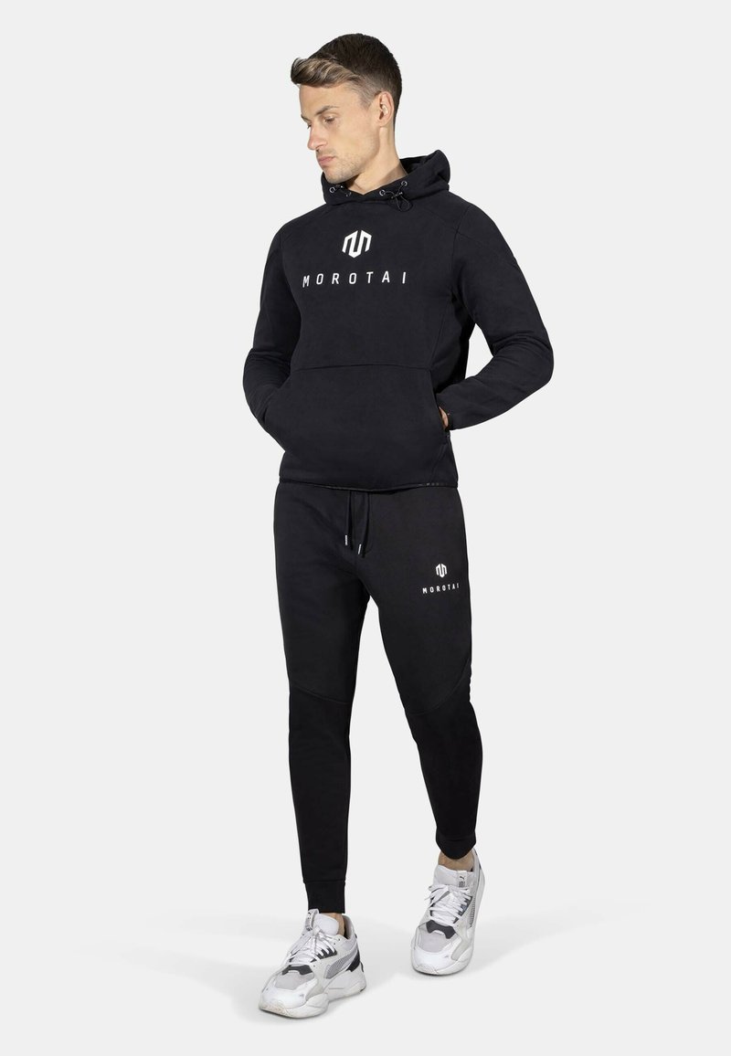 Melna kapuce ar "Morotai" logo uz krūtīm, kombinēta ar atbilstošiem melniem sporta biks�ēm ar logotipa detaļām. Valkāta ar baltām un pelēkām kedām.
