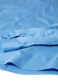Gaiši zila, garām piedurknēm, pogājama krekla uzvalks no gludas auduma. Tam ir klasiskā apkakle, pogu priekšpuse un pieguļošs siluets.