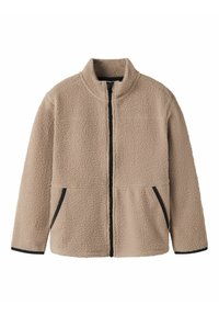 Jauns cilvēks stāv sānis skatā, valkājot gaiši rozā flīsa jaku, gaiši zilas plata kāju džinsas un brūnas slip-on kurpes.