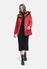 Sieviete ar viļņainiem matiem, tērpusies sarkanā kapučjakā ar melnu rāvējslēdzēju un aukliņām, stāv pret vienkāršu gaišu fonu.