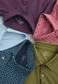 Piecas īsās piedurknes polo krekls dažādās krāsās: ķiršu sarkana, zaļa, gaisīgi zila un tumši zila ar rakstiem, uzsverot fakturētus audumus un pogu apkakles.