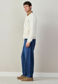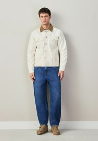 Vīrietis tērpies brīva piegriezuma zilās džinsa biksēs, valkājot bēša krāsas zamšādas mokasīnu apavus un krēmkrāsas jaku, stāvot pret vienkāršu fonu.
