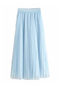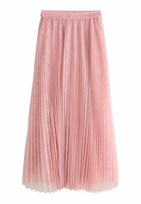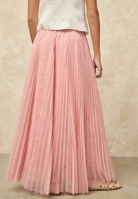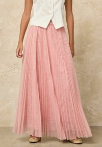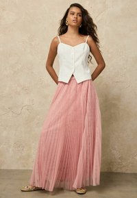 Jauna sieviete ar gariem viļņainiem matiem, valkājot zelta stīpas auskarus, baltu bezroku pogājamu topu un rozā plūstošu maksi svārku, stāvot pie teksturētas sienas.