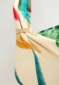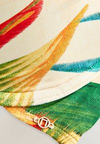 Bikini augšdaļa ar kakla aizdari un tropisko ziedu rakstu sarkanos, zaļos un zilos toņos uz krēmkrāsas fona, ar kaklā sasietu loku un polsterētām kausīšu.
