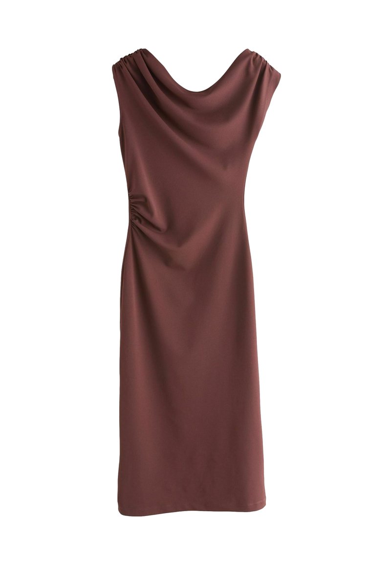 Brūna midi kleita bez piedurknēm ar drapētu apkakli un savāktu detaļu kreisajā pusē, attēlota uz balta fona.