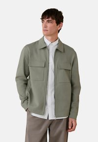 Melnā garām piedurknēm jaka ar priekšējo rāvējslēdzi, divām atloku kabatām uz krūtīm un salocītu apkakli.