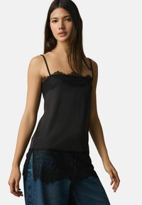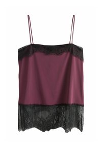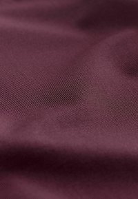 Sieviete, tērpusies burgundijas krāsas krekliņā ar melnu mežģīņu apdari un zelta riņķa auskariem, stāv pret vienkāršu gaišu fonu.